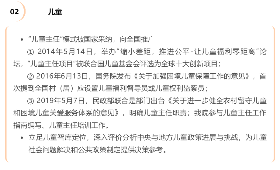 4. 自2010年起為民政部和聯(lián)合國兒童基金會合作開展的“中國兒童福利示范項(xiàng)目”提供項(xiàng)目協(xié)調(diào)和技術(shù)支持,探索“兒童主任”模式解決基層兒童福利與保護(hù)服務(wù)"最后一公里"問題,項(xiàng)目試點(diǎn)經(jīng)驗(yàn)于2014年被聯(lián)合國兒童基金會評為十大創(chuàng)新項(xiàng)目向全球推廣,2016年國務(wù)院出臺農(nóng)村留守兒童關(guān)愛保護(hù)和困境兒童保障政策,兒童主任模式全面落地,2019年全國已建成4.5萬名兒童督導(dǎo)員和62萬名兒童主任的基層兒童工作隊(duì)伍,兒童身邊有專業(yè)服務(wù)指日可待!