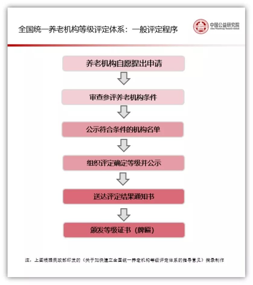 根據(jù)《指導(dǎo)意見(jiàn)》第(五)條:等級(jí)評(píng)定的程序一般包括養(yǎng)老機(jī)構(gòu)自愿提出申請(qǐng)、審查并公示符合參評(píng)條件的養(yǎng)老機(jī)構(gòu)名單、組織評(píng)定確定等級(jí)并向社會(huì)公示、送達(dá)評(píng)定結(jié)果通知書(shū)、發(fā)布公告,頒發(fā)等級(jí)證書(shū)(牌匾)等環(huán)節(jié)。