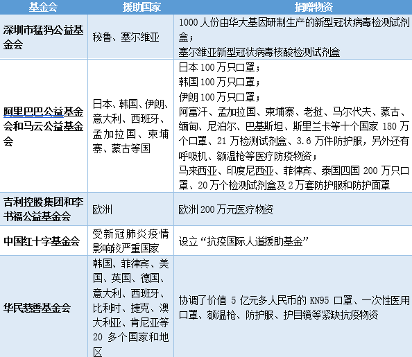 中國(guó)紅十字會(huì)、中國(guó)紅十字基金會(huì)、馬云公益基金會(huì)、阿里巴巴公益基金會(huì)、中國(guó)深圳猛犸公益基金會(huì)和北京新陽(yáng)光慈善基金會(huì)等慈善組織通過(guò)向其他疫情較為嚴(yán)重的國(guó)家和地區(qū)捐贈(zèng)醫(yī)療物資、組織志愿專(zhuān)家團(tuán)赴當(dāng)?shù)貐⑴c防控工作、設(shè)立專(zhuān)項(xiàng)基金等方式參與國(guó)際援助。就企業(yè)而言,恒大向中國(guó)紅十字會(huì)捐贈(zèng)1億元人民幣,用于國(guó)際援助;數(shù)字健康平臺(tái)微醫(yī)上線了全球首部關(guān)于新冠肺炎防治的中英文對(duì)照出版物,目前該平臺(tái)已有7746名醫(yī)生,累計(jì)援助海外同胞56058例。就高校而言,主要是通過(guò)高校校友會(huì)開(kāi)展國(guó)際援助活動(dòng),目前7所高校的校友會(huì)在國(guó)際援助中發(fā)揮了重要作用。