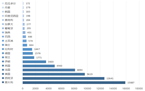 此次全球性突發(fā)疫情已造成數(shù)以萬(wàn)計(jì)的死亡病例,圖1為截至北京時(shí)間4月6日12時(shí)排名前20的國(guó)家及其累計(jì)死亡人數(shù)(除中國(guó))。其中意大利病死率自3月5日以來(lái)已升至12.32%,西班牙病死率自3月18日以來(lái)已升至9.67%3,兩國(guó)國(guó)土面積較小,患病人口密度大,面臨疫情失控風(fēng)險(xiǎn)。