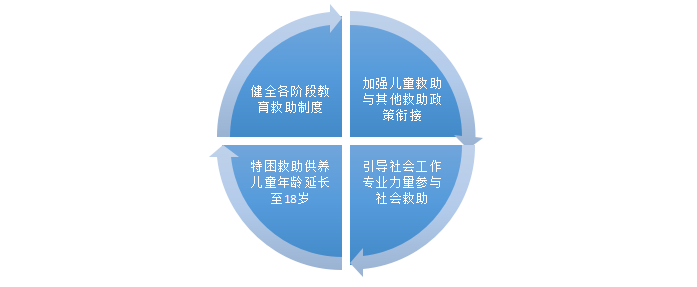 2020年8月,中共中央辦公廳、國務(wù)院辦公廳印發(fā)《關(guān)于改革完善社會救助制度的意見》,建立健全分層分類的社會救助體系。其中,特別關(guān)注兒童群體救護(hù)保護(hù)關(guān)注,主要體現(xiàn)4個(gè)方面:一是將特困救助供養(yǎng)覆蓋未成年人年齡從16周歲延長至18周歲;二是推進(jìn)殘疾兒童康復(fù)救助、重度殘疾人護(hù)理補(bǔ)貼、孤兒基本生活保障等工作,加強(qiáng)事實(shí)無人撫養(yǎng)兒童等困境兒童保障,鼓勵(lì)有條件的地方將困難殘疾人生活補(bǔ)貼延伸至低收入家庭;三是突出服務(wù)專業(yè)化,通過購買服務(wù)等方式,引導(dǎo)社會工作專業(yè)力量參與社會救助,不斷推進(jìn)專業(yè)化兒童服務(wù)與保護(hù)體系的建設(shè)。四是健全教育救助制度,對低保、特困家庭學(xué)生以及殘疾兒童等困兒童,采取減免相關(guān)費(fèi)用、發(fā)放助學(xué)金、安排勤工助學(xué)崗位、送教上門等方式。