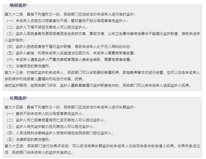 《民法典》構(gòu)設(shè)了“家庭監(jiān)護(hù)為主體、社會(huì)監(jiān)護(hù)作為補(bǔ)充、國(guó)家監(jiān)護(hù)為兜底”的多層次保障體系,新未保法中明確了民政部門作為國(guó)家監(jiān)護(hù)責(zé)任的落實(shí)部門,詳細(xì)列舉了由民政部門開展兒童臨時(shí)監(jiān)護(hù)或長(zhǎng)期監(jiān)護(hù)的情形和監(jiān)護(hù)形式,同時(shí)也明確了臨時(shí)監(jiān)護(hù)結(jié)束和民政部門與未成年人監(jiān)護(hù)關(guān)系終止的退出機(jī)制。