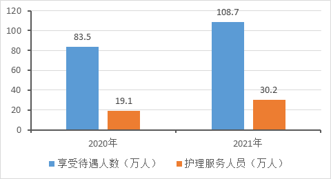 一是護(hù)理保險(xiǎn)正在推動(dòng)照護(hù)人員配置優(yōu)化。從兩年的統(tǒng)計(jì)公報(bào)數(shù)據(jù)來看,享受待遇人數(shù)從2020年的83.5萬增長至2021年的108.7萬,增長了25.2萬人;護(hù)理服務(wù)人員從19.1萬增長至30.2萬,增長顯著。護(hù)理服務(wù)人員與老年人的配比從1:4.4調(diào)整到了1:3.6。