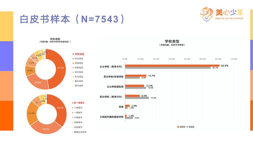 剛才主持人提到,今年的調(diào)查與往年相似,收集到七千多名中學生的反饋,他們主要來自華東、華北、全國各地,包括部分來自港澳和臺灣的學生,以及在海外學習的中國學生。他們主要分布在城市,尤其是新一線城市、一線城市和二線城市,占比較高。這些學生大多就讀于公立學校,其結(jié)構(gòu)與中國慈善活躍地區(qū)的布局和學生組成相一致,所以這個問卷調(diào)查對我們了解中學生參與公益的整體情況提供了較大參考價值。
