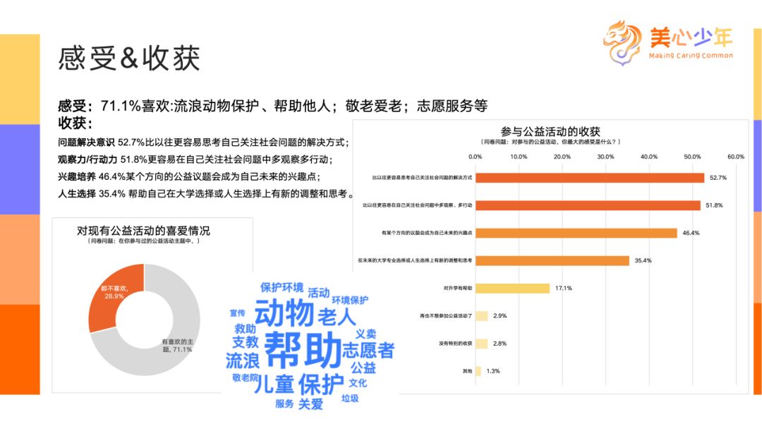 孩子們做公益以后,自己能收獲什么呢?這個問題設(shè)計是在引導(dǎo)他們關(guān)注社會問題和問題的解決方案。因為中學生已經(jīng)有自己的獨立意識和思辨能力,所以他們的問題意識和關(guān)注度有比較大的提升;另外,中學生的思考能力和行動意愿也有明顯提升;第三,在興趣培養(yǎng)方面,公益打開了一扇窗,幫助參與者挖掘出很多興趣點,進而進一步影響到他對未來升學、人生選擇的思考。這個方面的數(shù)據(jù)和變化比較明顯。