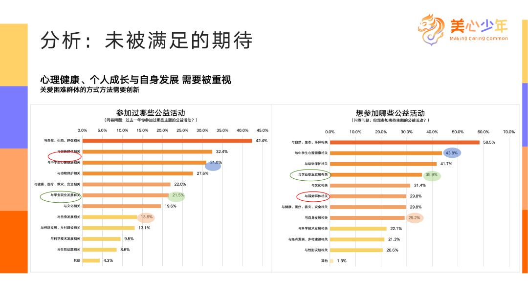 我們對具體活動內(nèi)容進行了比較,發(fā)現(xiàn)今年“實際參與”和“想要參與”之間存在差距,這些差距就是未來可以努力的方向。一是心理健康方面的活動尚未得到充分滿足。二是關(guān)于個人成長的困惑需要回應(yīng),包括學業(yè)和未來職業(yè)規(guī)劃。因為很多是高中生要考慮到未來考大學、學什么專業(yè)的問題,這些需要被重視。當然無論是供給、還是實際參與,都選擇得比較多的是幫助困難群體。這方面的公益形式需要創(chuàng)新,以更符合孩子的特征,不然總是“去敬老院”,的確不好玩,不是很有意思。