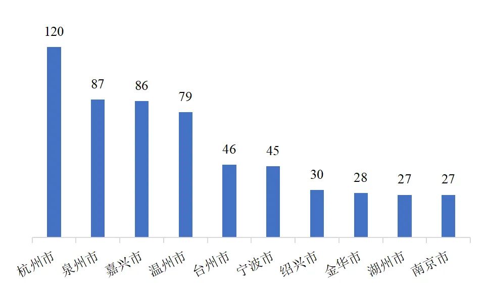 分地級行政區(qū)的情況來看,杭州市(120個)、泉州市(87個)、嘉興市(86個)、溫州市(79個)、臺州市(46個)、寧波市(45個)、紹興市(30個)、金華市(28個)、湖州市(27個)、南京市(27個)的縣級基金會數(shù)量居前。其中,有8個地級市隸屬于浙江省,福建省和江蘇省各有1個。