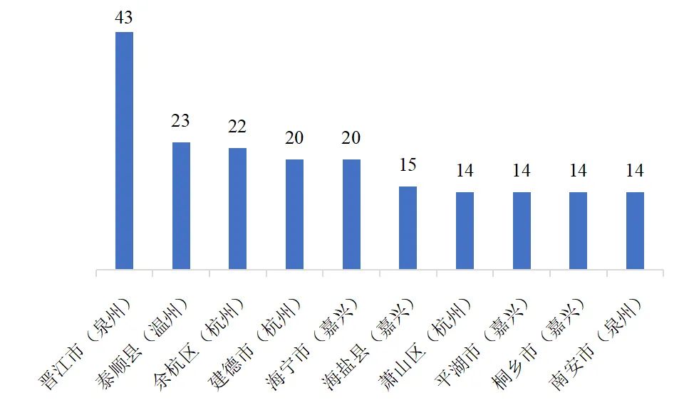 分縣級行政區(qū)的情況來看,晉江市(43個)、泰順縣(23個)、余杭區(qū)(22個)、建德市(20個)、海寧市(20個)、海鹽縣(15個)、蕭山區(qū)(14個)、平湖市(14個)、桐鄉(xiāng)市(14個)、南安市(14個)的縣級基金會數(shù)量居前。除晉江市和南安市位于福建省外,其余8個縣級行政區(qū)都位于浙江省,其中嘉興市有4個、杭州市有3個、溫州市有1個。