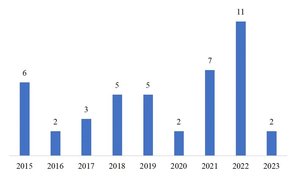 圖7 2015-2023年晉江市基金會登記數(shù)量(個)