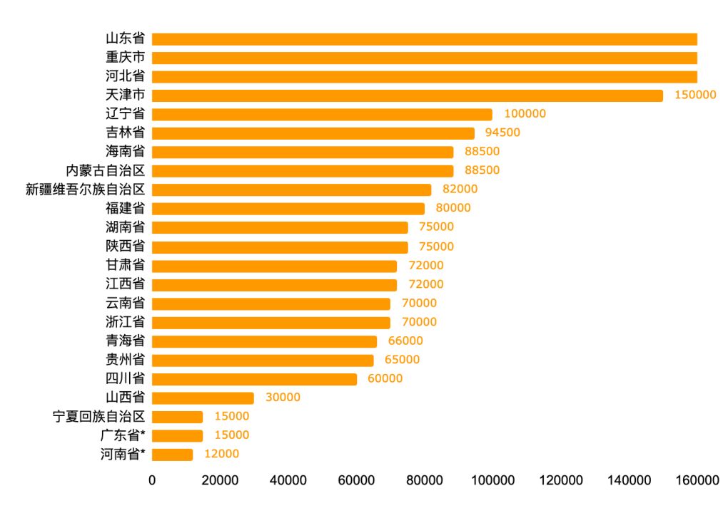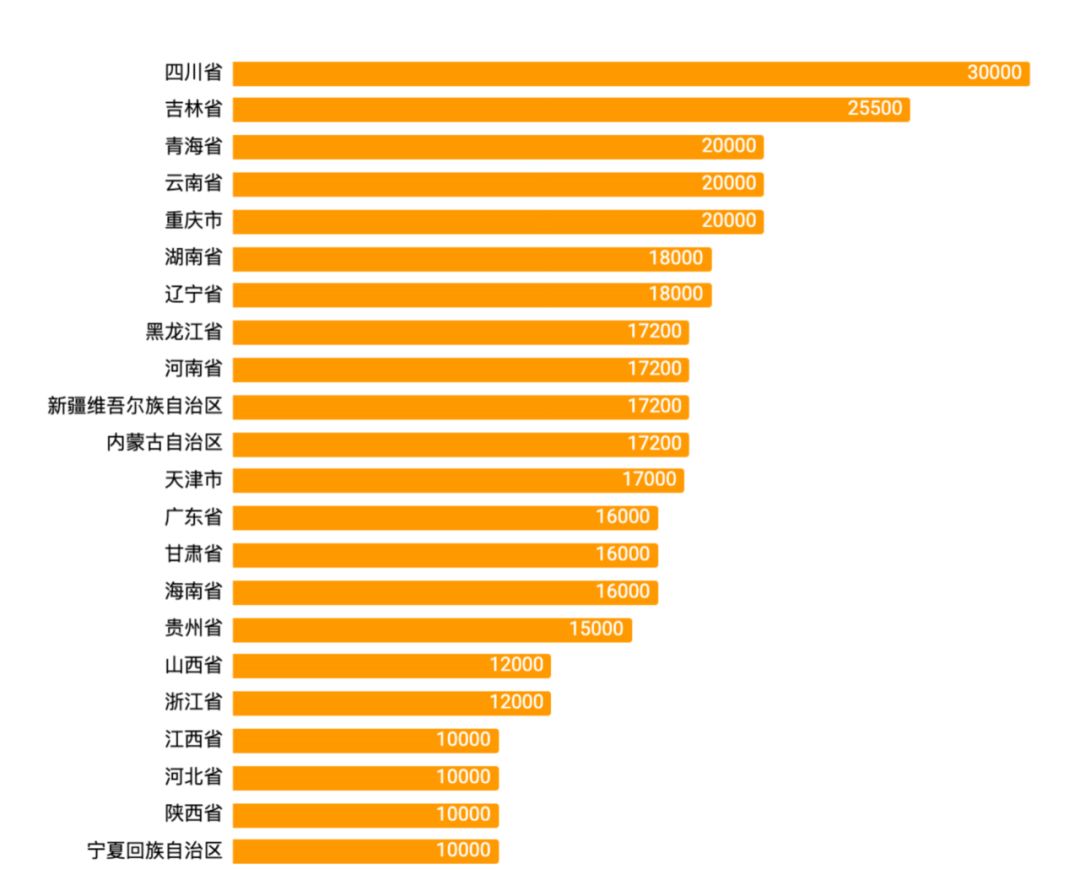 (因山東省、重慶市、河北省免費提供人工耳蝸設備,價值無法進行統(tǒng)一衡量,因此在圖中排序放在首位,但不標注具體數據。廣東省和河南省未具體說明人工耳蝸器材補助費用,表中僅為手術費用補貼。)