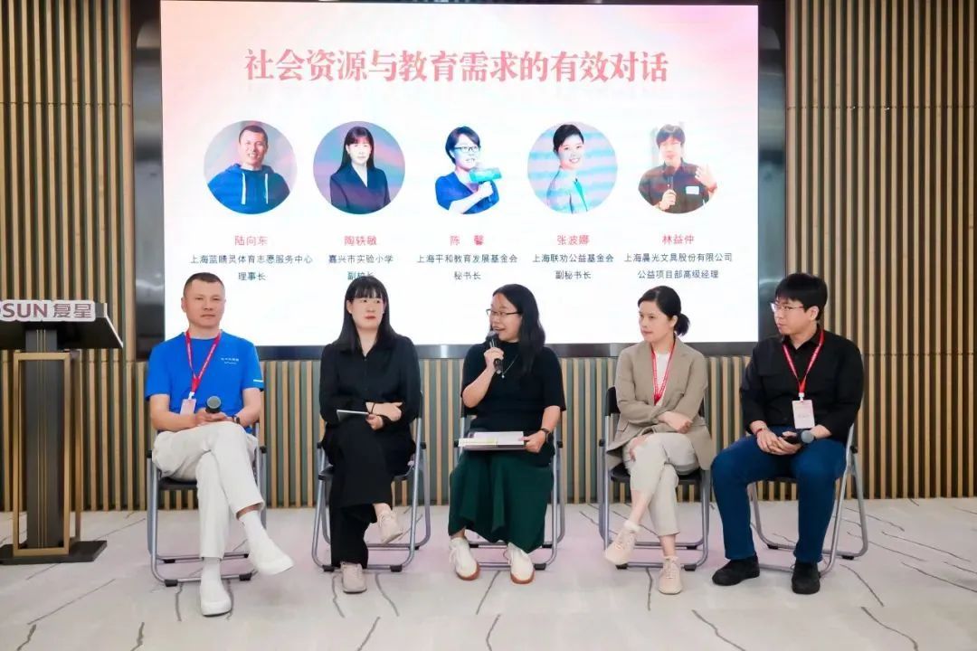 圓桌論壇環(huán)節(jié)由上海平和教育發(fā)展基金會陳馨秘書長擔(dān)任主持,與上海藍(lán)睛靈體育志愿服務(wù)中心陸向東理事長、嘉興市實驗小學(xué)陶軼敏副校長、上海聯(lián)勸公益基金會張波娜副秘書長、上海晨光文具股份有限公司公益項目部高級經(jīng)理林益仲老師共同展開《社會資源與教育需求的有效對話》。