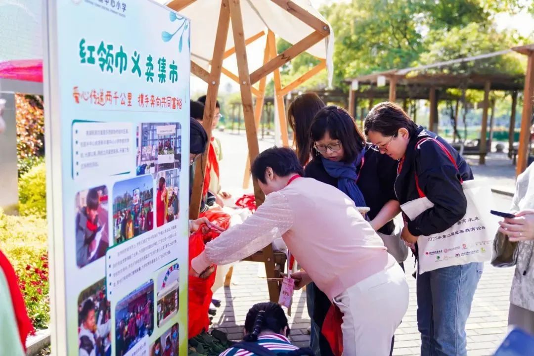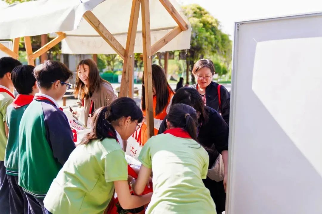 同學(xué)們擺設(shè)紅領(lǐng)巾義賣集市,出售環(huán)保袋和新鮮時蔬,吸引來賓紛紛購買。