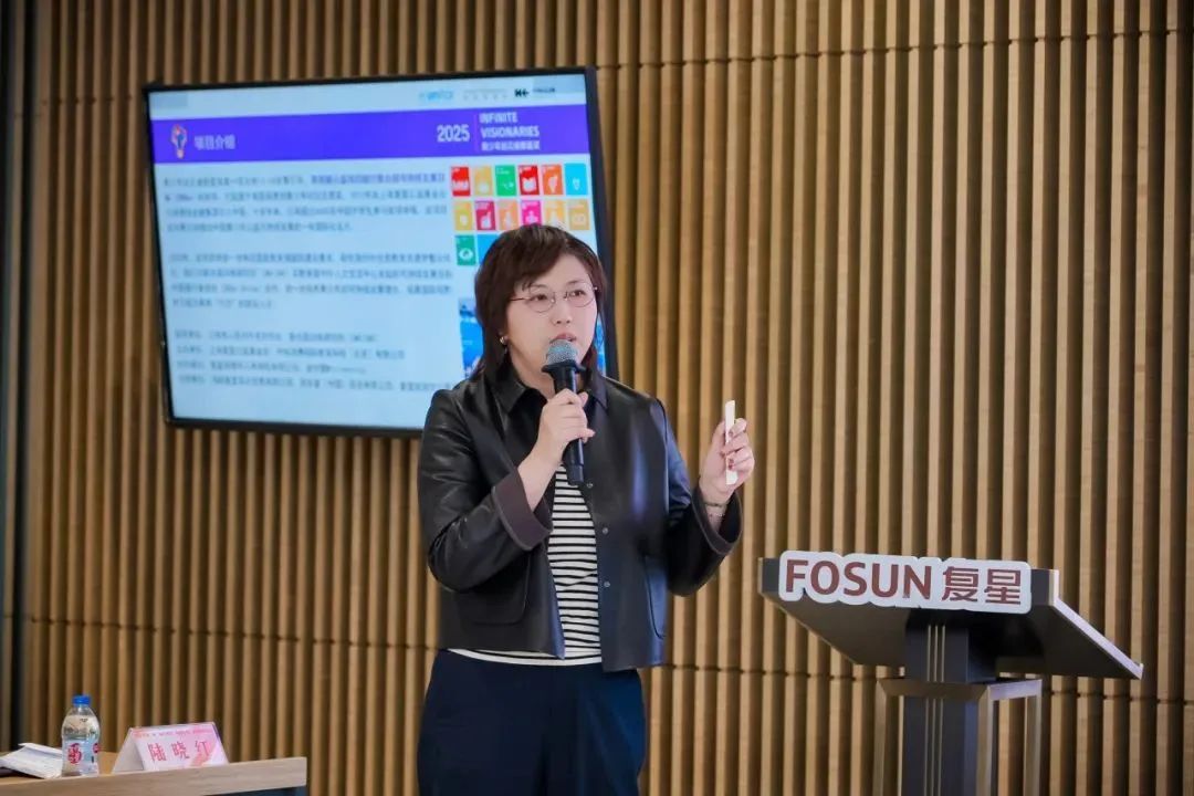 上海復(fù)星公益基金會聯(lián)席執(zhí)行秘書長俞曦老師介紹基金會“青少年遠(yuǎn)見者新星獎”項目,12年回首,分享學(xué)生們在公益慈善領(lǐng)域的優(yōu)秀案例,希望幫助中國的中學(xué)生在世界舞臺上展現(xiàn)他們的風(fēng)采。