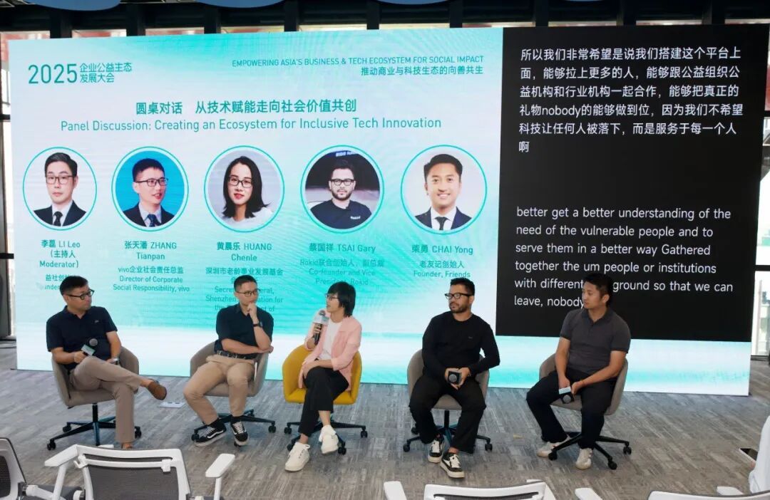 科技不僅是效率工具,更應(yīng)成為解決社會不平等、促進包容發(fā)展的關(guān)鍵力量。面對技術(shù)高速發(fā)展、人口趨勢、社會問題等挑戰(zhàn),科技如何系統(tǒng)性地、可持續(xù)地創(chuàng)造社會價值,在由益社創(chuàng)始人李磊主持與引導(dǎo)的圓桌環(huán)節(jié)中,vivo企業(yè)社會責(zé)任總監(jiān)張?zhí)炫?、深圳市老齡事業(yè)發(fā)展基金會秘書長黃晨樂、Rokid聯(lián)合創(chuàng)始人蔡國祥、老友記創(chuàng)始人柴勇共同展開了一場跨界對話,分別從理念轉(zhuǎn)變、技術(shù)能力與實際需求精準匹配、可持續(xù)任性未來建設(shè)幾方面進行深入討論。